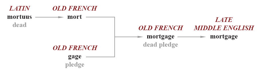 Late Middle English: from Old French, literally ‘dead pledge’, from mort (from latin mortuus ‘dead’) + gage ‘pledge’.